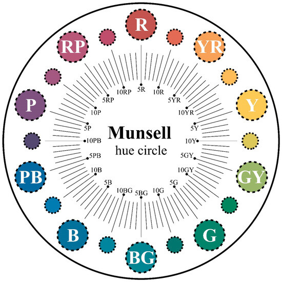 For , if color i is chromatic, the value of is determined by the hue of the color. Conversely, if color i is achromatic, the value of is determined by the value of the color. Therefore, the calculation formula for can be expressed as follows: