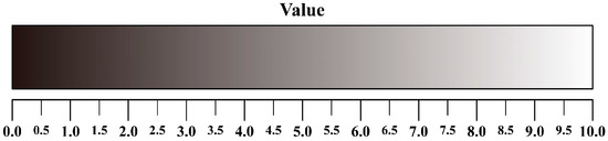 where represents the contribution of chromatic color i to the aesthetics of product color matching, and represents the contribution of achromatic color i to the aesthetics of product color matching. The calculation methods for both are described below. Before beginning the calculation, a sensibility evaluation based on target imagery should be conducted for the selected colors to determine their priority. Subsequently, if the color is chromatic, the specific calculation steps are as follows: first, divide the Munsell hue circle into 100 equal parts, using the 10 primary hues (Red (R), Yellow–Red (YR), Yellow (Y), Green–Yellow (GY), Green (G), Blue–Green (BG), Blue (B), Purple–Blue (PB), Purple (P), Red–Purple (RP)) as reference points (see Figure 1). Second, assign a hue value of 1 (i.e., = 1) to the color ranked first in the sensibility evaluation and a hue value of 0 (i.e., = 0) to the color ranked last. Then, divide the entire hue circle into two parts based on these two hue values (both starting from = 0 to = 1 in a clockwise and counterclockwise direction, respectively). Third, locate the hue value of the color used in product color matching on the hue circle, and use the proportion of the hue value within either part of the hue circle as the contribution of this chromatic color to the aesthetics of product color matching. If the color is achromatic, the specific calculation steps are as follows: first, divide the value bar into 100 equal parts (see Figure 2). Second, assign a value of 1 ( = 1) to the color ranked first in the sensibility evaluation and a value of 0 ( = 0) to the color ranked last. Then, divide the entire value bar into two parts (both starting from = 0 to = 1). Third, locate the value of the color used on the value bar, and use the proportion of the value within either part as the contribution of this achromatic color to the aesthetics of product color matching.