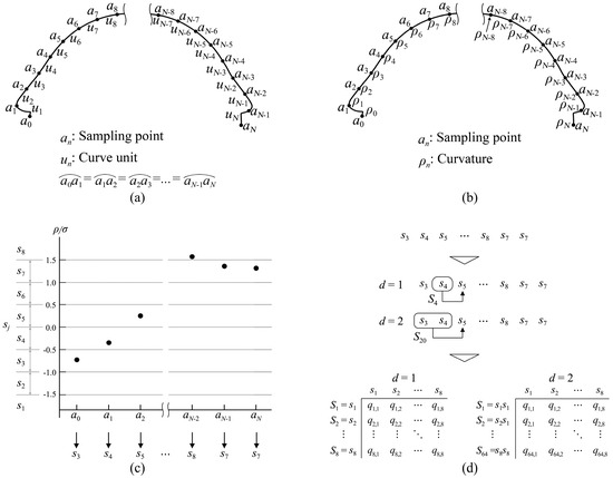 The calculation process of quadratic curvature entropy: (a) sampling point and curve unit; (b) sampling of the curvature; (c) quantization based on the curvature; (d) calculation of the transition probability.