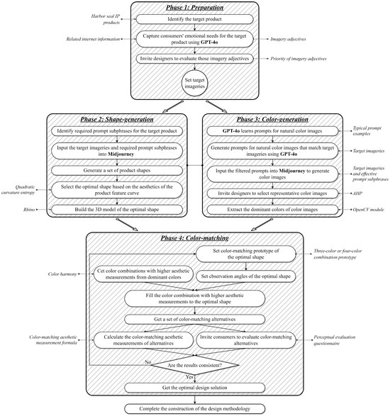 Dalian is a well-known coastal tourist city in China. The harbor seal, a unique marine species in Dalian, is also a Class I protected animal in China. Every year, a large number of tourists from both domestic and international locations visit Dalian to see the harbor seals. Therefore, this study takes the design of Harbor Seal IP cultural products as a case study to demonstrate the implementation procedures of the proposed design methodology and validate its effectiveness. Specifically, drawing on the theories and methodologies discussed in Section 2, this study integrates text-GLM, image-GLM, color harmony, color-matching aesthetic measurement, and quadratic curvature entropy to propose a design methodology consisting of the following four phases: preparation (Phase 1), shape generation (Phase 2), color generation (Phase 3), and color matching (Phase 4). Using the harbor seal as an example, the visual implementation process is illustrated in Figure 4, and the generalized implementation procedures are described as follows.