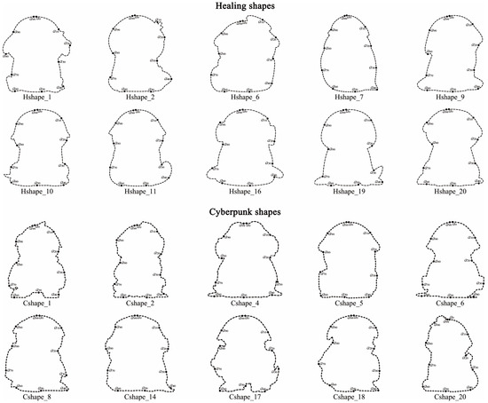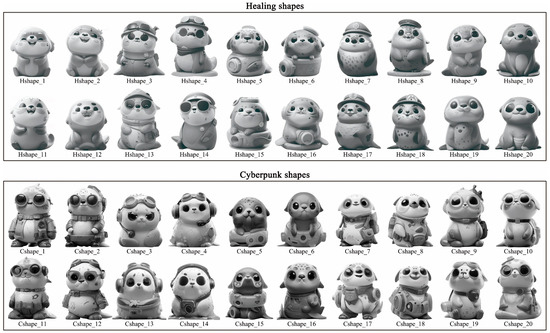 The prompt was entered into Midjourney’s “/imagine” command to generate harbor seal IP product shapes reflecting the target imageries (i.e., healing and cyberpunk). After multiple runs, 20 shapes were created for each target imagery, as illustrated in Figure 5. Hshape_1 to Hshape_20 represent the healing shapes, while Cshape_1 to Cshape_20 represent the cyberpunk shapes. Subsequently, to select shapes that accurately correspond to the target imageries, 20 product designers were invited to evaluate the generated shapes based on the target imagery and select 10 typical shapes. Statistical analysis showed that the top 10 healing shapes were Hshape_1, Hshape_2, Hshape_6, Hshape_7, Hshape_9, Hshape_10, Hshape_11, Hshape_16, Hshape_19, and Hshape_20, while the top 10 cyberpunk shapes were Cshape_1, Cshape_2, Cshape_4, Cshape_5, Cshape_6, Cshape_8, Cshape_14, Cshape_17, Cshape_18, and Cshape_20.