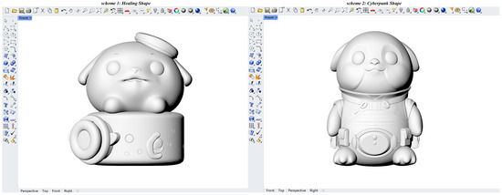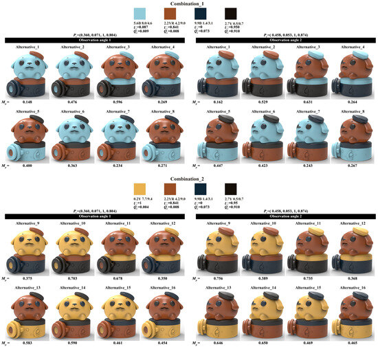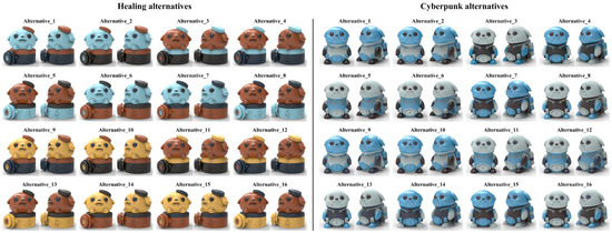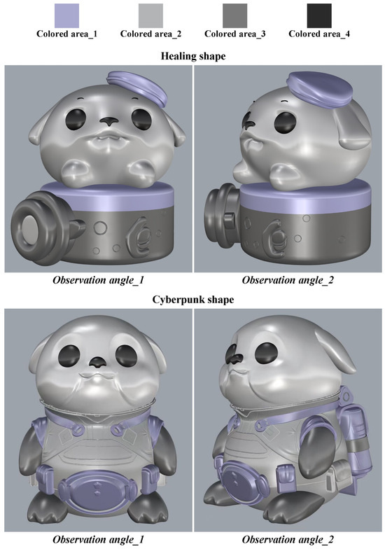 The four-color combinations combination_1 and combination_2 were applied to the two color-matching prototypes of the optimal healing shape, while combination_3 and combination_4 were applied to the two color-matching prototypes of the optimal cyberpunk shape. Considering the anthropomorphized shape features of the harbor seal IP product, the achromatic color or the chromatic color with the lowest value from the four-color combination were filled into the eye area. Given this constraint, one four-color combination could generate eight color-matching alternatives. Combination_1 and combination_2 generated 16 healing alternatives, while combination_3 and combination_4 generated 16 cyberpunk alternatives. Subsequently, the KeyShot was used to render the alternatives with realistic lighting effects, as shown in Figure 12.