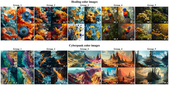 Step 6: Generate numerous natural color images using Midjourney and select representative images based on the analytic hierarchy process (AHP). Input the effective prompt subphrases and key prompt subphrases (i.e., target imageries) into Midjourney’s “/imagine” command. Running the prompt multiple times will generate numerous natural color images. Subsequently, invite designers to use AHP to select representative color images from the generated images based on the target imagery.