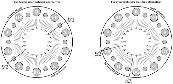 For quantitative evaluation, Equations (4) to (7) introduced in Section 2.2.2 were used to calculate , , and successively, ultimately obtaining the color-matching aesthetic measurement (Mp) for each alternative. First, students and teachers specializing in design were invited to rate the five healing colors and five cyberpunk colors in Figure 11 based on the criteria of “How healing is this color?” and “How cyberpunk is this color?” The evaluation results showed that the first and last of the five healing colors were 0.2Y 7.7/9.4 and 9.9B 1.4/3.1, respectively; for the cyberpunk colors, they were 8.2BG 8.3/1.1 and 6.0PB 2.4/2.6. The hue values of the first and last colors were used to divide the hue circle into two parts (see Figure 13), and the contribution of each chromatic color to the color-matching aesthetic measurement () was determined accordingly. Second, the value and chroma of the colors were substituted into Equation (6) to determine their contribution to the color-matching aesthetic measurement (). Third, Photoshop was used to display the number of pixels in each colored area, which was taken as the area of that colored area (see Figure 14). The area parameter was then substituted into Equation (7) to determine the contribution of the area to the color-matching aesthetic measurement (). Finally, , , and were substituted into Equation (4) to obtain the aesthetic measurement (Mp) for each color-matching alternative. The calculation results are shown in Figure 15 and Figure 16, and the statistical results are presented in Table 10 and Table 11. After summing the aesthetic measurements for the two observation angles, Alternative_11 had the highest score among all healing alternatives (Mp = 1.413), and Alternative_15 had the highest score among all cyberpunk alternatives (Mp = 0.756). Therefore, based on the quantitative evaluation results, Alternative_11 and Alternative_15 were considered the optimal design solutions.