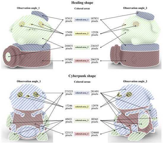 The area of each colored area in the shapes of healing and cyberpunk from two observation angles.