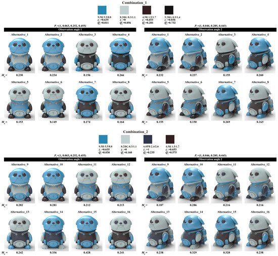 For qualitative evaluation, tourists were invited to assess the color-matching alternatives shown in Figure 12. The evaluation criterion was “How healing/cyberpunk is the color matching of this harbor seal IP cultural product?” on a scale from 0 to 1. Out of 140 distributed questionnaires, 128 valid responses were received. Statistical analysis yielded a Cronbach’s α value of 0.82, demonstrating acceptable questionnaire results. Table 12 and Table 13 present the average scores for each alternative under the two observation angles and their total scores. Regarding the total score, Alternative_14 received the highest score (score = 1.64), and Alternative_15 achieved the highest score (score = 1.69). Consequently, based on the qualitative evaluation results, Alternative_14 and Alternative_15 were considered the optimal design solutions.