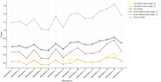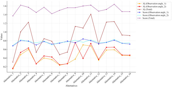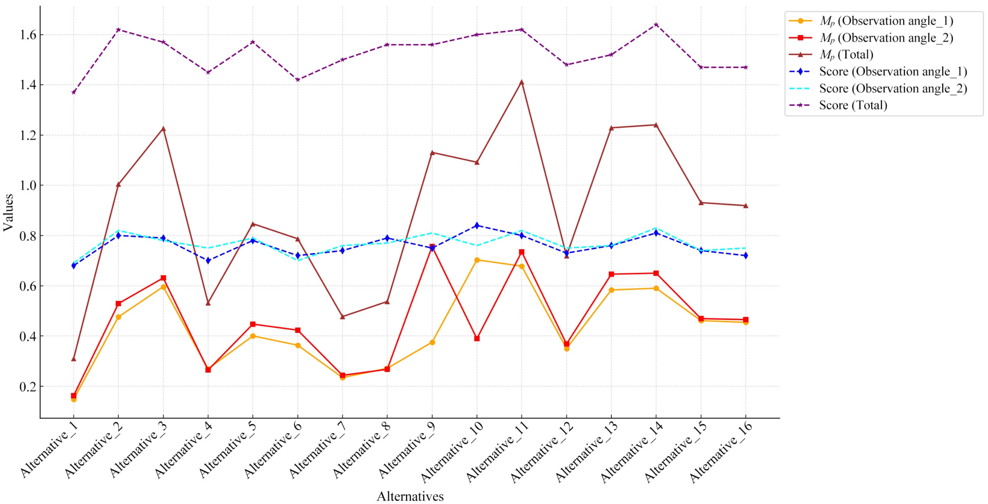 This paper emphasizes the quantitative evaluation process for content generated by GLMs. To select the optimal shape and representative color images from the GLM-generated content, this study employed quantitative evaluation methods based on QCE and AHP. Specifically, QCE was used as an indicator for evaluating shape aesthetics, where the lower the entropy value of the shape curve, the higher the aesthetic measurement. AHP was used to evaluate whether the color images corresponded to the target imageries, where higher weight values indicated better alignment with the target imagery. The quantitative evaluation not only improved the practicality of the design methodology but also ensured its rigor and scientific basis. In addition, a combination of quantitative and qualitative evaluations was used to select the optimal color-matching solution. The quantitative evaluation applied the color-matching aesthetic measurement formula to determine the aesthetic measurement of alternatives from two observation angles (see Table 10 and Table 11). In the qualitative evaluation, a perceptual evaluation questionnaire for tourists was used to obtain scores for the alternatives from two observation angles (see Table 12 and Table 13). Figure 17 presents the scores of the 16 healing alternatives in both quantitative evaluation (i.e., Mp (Observation angle_1), Mp (Observation angle_2), and Mp (Total)) and qualitative evaluation (i.e., score (Observation angle_1), score (Observation angle_2), and score (total)), while Figure 18 shows the scores for the 16 cyberpunk alternatives. In this paper, Pearson correlation analysis was conducted between the total values of the quantitative evaluation (i.e., Mp (Total)) and the qualitative evaluation (i.e., score (total)) (see Table 14). The results showed that the correlation coefficients were greater than 0.7, indicating a statistically significant correlation between the quantitative and qualitative evaluation results. Therefore, the optimal design solutions were selected based on a comprehensive consideration of both evaluation results.