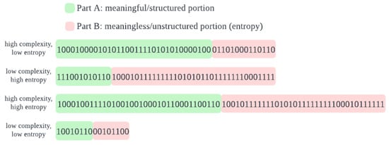 Entropy and complexity are two important concepts in information theory and science more broadly. Given the optimal (i.e., shortest) description of a system, where portion A consists of the macrostate as we have outlined, it is easy to see (shown in Appendix A) that the expected length of portion B is proportional to the Gibbs entropy. Thus, one could claim that a decrease in Gibbs entropy is equivalent to an increase in complexity, assuming the overall description length remains constant. However, it is likely that this assumption would often be violated in practice: even the same system can have a varying description length as it moves through different configurations. This is shown graphically in Figure 1. Comparing row two to row one, we see increasing entropy means decreasing complexity, because the two rows happen to have the same total description length. However, rows three and four show that, in the realistic case that total length can vary, high entropy can correspond to either high or low complexity. Entropy is the length of the non-meaningfully structured portion of the optimal description of the system, whereas complexity is the length of the meaningfully-structured portion. According to this argument, the two notions of entropy and complexity are, in general, independent, and this suggests, among other things, that an increase in entropy in accordance with the second law of thermodynamics does not necessarily imply a reduction in complexity.