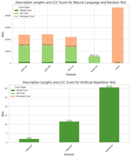 The description cost, in bits, for text in different natural languages, along with simplified English sentences and random text (top), and for artificially generated repetitive text. This is broken down into the cost to describe the model, the cost to index into that model to describe part of the data (‘idx cost’), and the residual portion not accounted for by the model. Portion A of the description comprises the model cost and the index cost. This constitutes our LCC score and is marked in green. Random text has the highest total cost but the lowest meaningful cost.