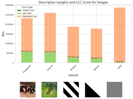 The mean description cost, in bits, over 100 randomly sampled images of various types (one example displayed below each column). The cost is broken down into that for the model, for indexing into that model to describe part of the data (‘idx cost’), and for the residual portion not accounted for by the model. Portion A of the description comprises the model cost and the index cost. This constitutes our LCC score and is marked in green. Random images have the highest total cost but the lowest meaningful cost. For readability, the displayed heights for the residual portion are reduced by a factor of 5.