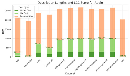 Figure 5 shows the resulting scores for various types of audio: human speech in English, Irish and German; random noise, sampled from a uniform distribution; simple, repetitive signals, a tuning fork and a continuously ringing electronic bell; and some examples of ambient noise: rainfall and muffled crowded human speech (walla). We see the same patterns as before: human speech receives the highest score, random noises have a high total description length but almost all of this is in portion B, so they receive a very low score, and simple repetitive signals have a score in between the two. It is striking that the three natural languages receive such a similar score to each other, which is consistent with the general principle that, phonetically, all human languages are roughly equally efficient at conveying meaning [22,23,24].