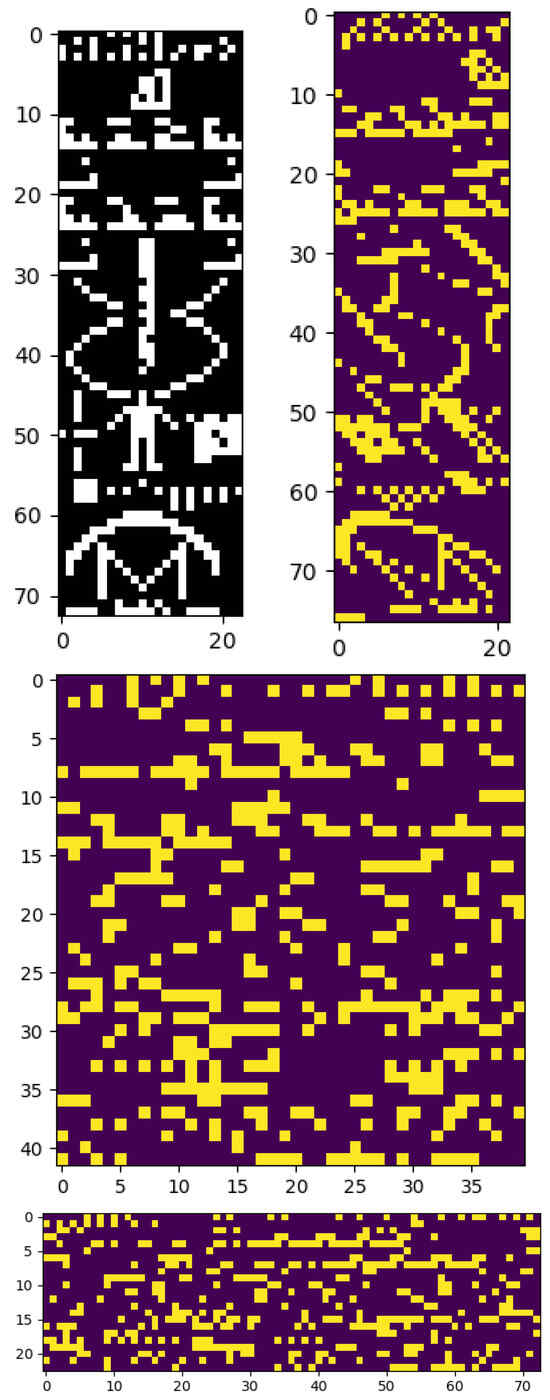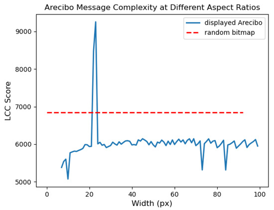 Now, we directly consider the case of interplanetary communication, by computing the LCC score for the Arecibo message, a sequence of 1679 bits broadcast by a group of Cornell and Arecibo scientists, including Carl Sagan and Frank Drake, in 1975 [25]. When depicted as a 73 × 23 bitmap image, as shown in Figure 7 (top left), it shows a series of simple shapes and patterns designed to convey information about earth and humankind. When depicted with an aspect ratio that differs by more than +/−1 from this, these shapes are lost and they become unintelligible to human eyes. The signal length of 1679 was chosen to be semi-prime so it only exactly factors in two unique ways: 73 × 23 or 23 × 73. We could imagine that the receiver is unsure of the exact start and end point, which introduces error in the possible length and greatly increases the set of possible aspect ratios. In any case, the problem of singling out the correct one of 73 × 23 based only on the resulting image contents is an instructive one for the present purposes.