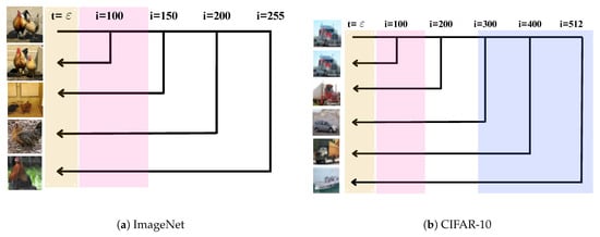 For the ImageNet-64 dataset, https://www.image-net.org/ (accessed on 1 August 2023), the total duration of the SBD process was set to , with the time-dependent diffusion coefficient defined as . The interval was discretized into 255 non-uniform time steps, denoted as . Larger time steps were allocated during the early stages of the reversed SDE and progressively smaller steps in the later stages. Further details on this discretization can be found in Appendix D.1 of []. In this setup, the time dependence is indexed as .