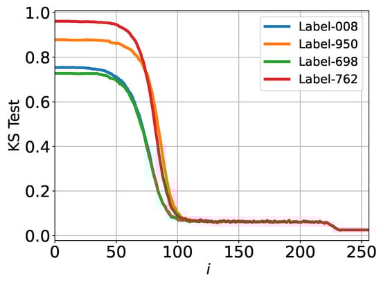 Kolmogorov–Smirnov (KS) test applied to the ImageNet dataset. Different colors represent different classes/labels: 008 (hen), 950 (orange), 698 (palace), and 762 (restaurant, eating house, and eatery).