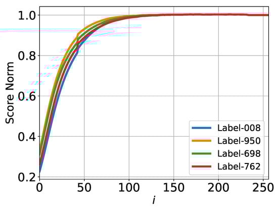 Consistent with the dynamics observed in the Kolmogorov–Smirnov (KS) analysis (Figure 2), significant changes in the normalized score function 2-norm begin at approximately i ≈ 50 and are largely completed by i ≈ 100–150. This behavior suggests that, if the score function norm is used as a criterion, no substantial additional information about the GT samples is being encoded into the score function at later times.