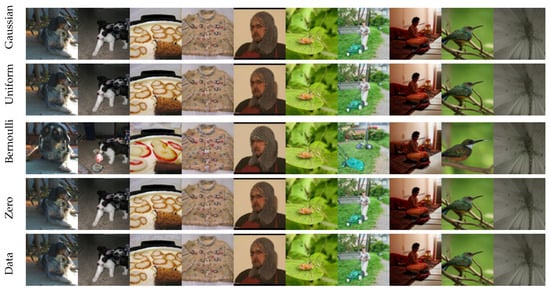 Results of running the reverse process with different initializations: Gaussian (), uniform (), zero (), GT data (), and Bernoulli ().