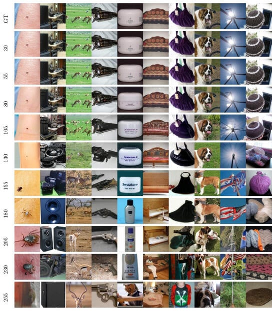 Moreover, moving from one column to the next—which corresponds to different initial images and labels—reveals some significant variation in the specific time at which the transition occurs; that is, dependence on the GT sample and its class—see Section 5.2 for further discussion of the strong sensitivity to the GT sample.