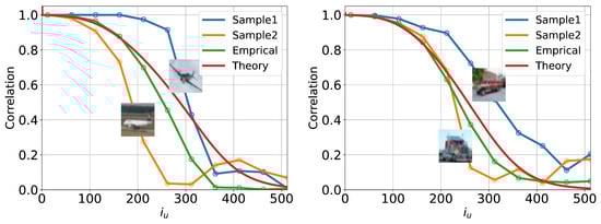 The results for are presented in Figure 7, which shows a monotonic decrease in with increasing () across all classes. We observe that the curves eventually saturate, though at values that vary considerably across classes. We attribute this phenomenon to certain distinctive features that may be relatively uniform within a given class—for example, the predominance of orange hues within the “oranges (fruits)” class—which can sustain higher U-Turn auto-correlations within the class even at a large .