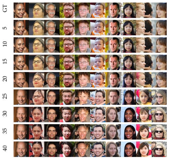 Visual illustration of the U-Turn at different in the scheme using the deterministic reverse process (sampler) is presented for the Flickr-Faces-HQ (FFHQ) dataset []. This dataset consists of 70,000 high-quality PNG images at 1024 × 1024 resolution and showcases significant variation in terms of age, ethnicity, and image backgrounds. Additionally, the dataset includes a diverse range of accessories such as eyeglasses, sunglasses, hats, and more.