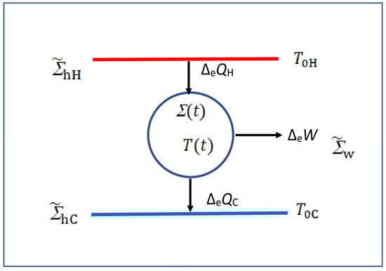 Various thermodynamic quantities in Figure 1 may carry an explicit time dependence during different parts of the protocol required for ; they may also be required to either describe irreversible processes or to denote time-varying fields of various mediums. What is impressive is that Carnot carefully distinguishes between macroheat exchange and macrowork exchange so much so that the first one occurs at two different temperatures (see C-Th-1) reversibly, but the connections between the two temperatures occur reversibly (R) without any macroheat exchange with any heat medium. He claims [1] (pp. 56–57) that