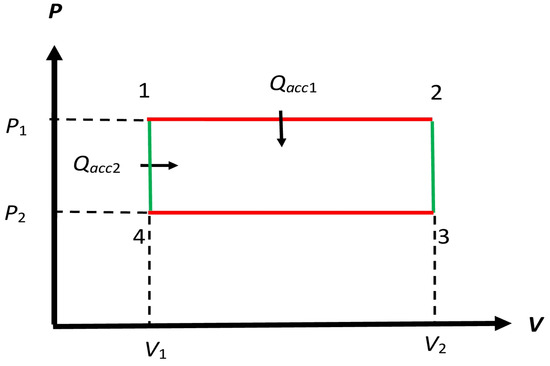 The description of the seven steps is such that the system does not come back to the initial state after the end of during the first cycle [22]. In other words, the initial state 1 is to the right of with a slightly higher volume. This is because of the experimental setup that cannot determine the position so that the adiabat will heat up the system to have the exact value . This problem does not occur in the protocol specification described in Section 2.4.