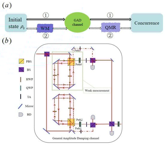 It is presumed that both qubits are subjected to an independent yet identical GAD channel in Figure 1a. Consequently, the initial pure state inevitably transforms into a mixed state, which can be described by