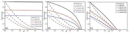 By combining Equations (4)–(6), one can easily calculate the concurrence of the system after evolution. In Figure 2, the concurrence of the X-type initial state is plotted as a function of the dissipation parameter d with different environmental temperature parameters r, considering various initial states including the Bell state, Werner state, and general state. As can be seen from Figure 1, for the three initial states, when the initial dissipation parameter d is small, the difference in the entanglement under different temperature parameters r is minimal. As the dissipation parameter d increases, the difference in the entanglement under different temperature parameters r also becomes more significant, and entanglement sudden death even occurs in the system under higher temperature parameters r. Given a fixed dissipation parameter d, Figure 2 also reveals that as the temperature parameter r increases, the entanglement of the system increases. This is because although the temperature parameter r is increasing, it can be seen from Equation (1) that the larger r is, the lower the corresponding environment temperature is, and more states are in the ground state. When r is low and the corresponding temperature is high, the system will absorb energy from the environment and transition to the excited state. Compared with the ground state, the excited state is more likely to interact with the environment, thus reducing the entanglement of the system. Therefore, when selecting the experimental environment, it is advisable to choose an environment with as low a temperature as possible to reduce the loss of the entanglement. Additionally, we can also utilize the WMR scheme to protect the entanglement of the system.