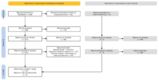 - Page, M.J.; McKenzie, J.E.; Bossuyt, P.M.; Boutron, I.; Hoffmann, T.C.; Mulrow, C.D.; Shamseer, L.; Tetzlaff, J.M.; Akl, E.A.; Brennan, S.E.; et al. The PRISMA 2020 statement: An updated guideline for reporting systematic reviews. BMJ 2021, 372, n71. [Google Scholar] [PubMed]