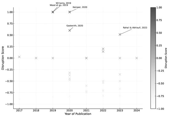 Disruptive articles in the corpus (Disruption Score > 0.5) [,,,,]. This scatter plot displays articles with a disruption measure [] above 0.5, indicating a significant departure from the prior literature. Each point represents an article, positioned according to its year of publication and disruption score. Higher values suggest that subsequent works primarily cite the article itself rather than its references, signaling a shift in research direction. Annotations highlight selected articles with notable disruption scores.