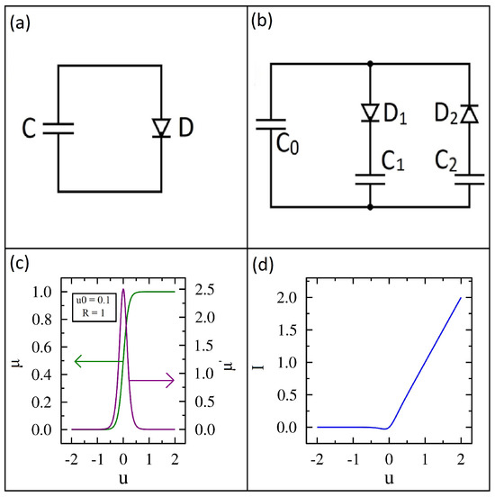 Two circuits analyzed in this study and diode properties shown with and . (a) Diode−capacitor circuit. (b) Two diode and three capacitor circuit. (c) Diode conductance (green curve) and its derivative (purple curve) shown versus diode voltage. (d) Diode current−voltage characteristics.