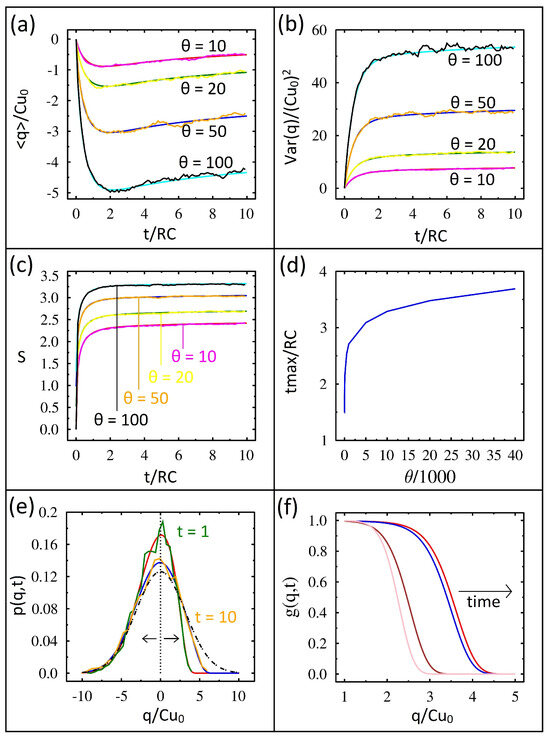 Numerical solutions of FP (smooth lines) and IL (jagged lines) equations for the diode−capacitor circuit shown in terms of dimensionless variables. (a) Capacitor charge vs. time for four temperatures. (b) Variance vs. time for four temperatures. (c) Shannon entropy vs. time for four temperatures. (d) Time to reach maximum charge vs. temperature. (e) Probability distribution vs. charge at two simulation times. At time , FP (red curve) and IL (green curve). At time FP, (blue curve) and IL (yellow curve). The vertical dashed line at zero charge represents the initial conditions. The two arrows indicate the spreading direction in time. The equilibrium solution is shown as a dotted−dashed line. (f) Time evolution of the probability distribution divided by the equilibrium distribution vs. charge at four simulation times. The left two curves are at times 1 and 2, while the right two curves are at times 5 and 6.