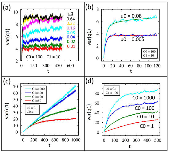 For this more complicated circuit, we begin by presenting the results for the variance of the charge on capacitor , instead of its average charge. We set the initial variance to zero, and we calculated the final variance using Equation (5). Knowing the extrema helps explain the dynamics. We performed numerical simulations of Equations (6)–(8) and averaged 3000 realizations for IL. We generally set and for these simulations.