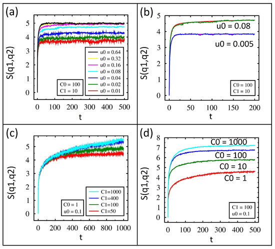 Numerical solutions for entropy using and . (a) Time dependence of entropy from IL for different values of and fixed values for and . (b) Comparison of FP (smooth lines) and IL (jagged lines) for fixed values of and while changes from 0.005 to 0.08. (c) Entropy for different values of and fixed values of and . (d) Entropy for different values of and fixed values of and .
