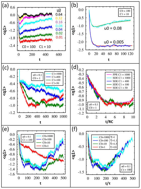 We performed numerical simulations of Equations (3) and (4). We use the first-order Milstein numerical scheme for IL, and for FP we use an explicit forward in time and centered in space scheme on a square grid in q with and [33]. The averages presented from Equation (3) are found after performing 3000 realizations. For this first circuit, we present most of our results in terms of dimensionless variables, which helps us present the large range of parameter values used in the study.
