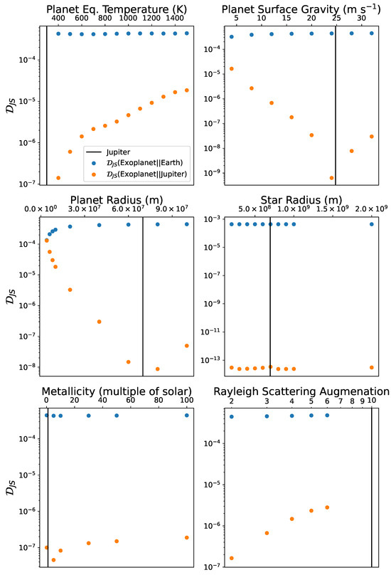 Increasing the strength of Rayleigh scattering causes information divergence not by impacting the strength of the absorption lines but by creating a spectral tilt in the near-infrared [58]. This reduces at the low wavelength absorption lines in the spectrum. Therefore, just as with the other parameters, the values of the Rayleigh scattering factor closest to Jupiter’s have the lowest . Similarly, changing the metallicity impacts the relative strength of absorption lines for different molecules. As a consequence, metallicities closest to Jupiter have the lowest , although the differences are relatively small (smaller than an order of magnitude) compared to other physical parameters.