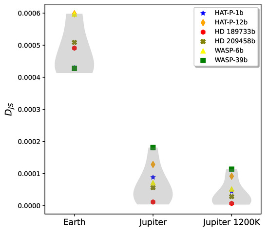 In Figure 2, we find that the distribution comparing the six gas giants to the two Jupiter-like planets do not overlap with the distribution comparing them to Earth. This illustrates that is able to distinguish between Jupiter-like and Earth-like planets. There is, however, an overlap between the two distributions comparing the gas giants to Jupiter and to a 1200 K Jupiter. This is due to the similarity of the comparison planets. Still, the mean (bulge in the gray violin plots) of the 1200 K Jupiter distribution is the lower of the two distributions, indicating that is able to identify the temperature similarity of the hot Jupiters and the hotter, 1200 K Jupiter clone. We also show the results of specific comparisons for the six gas giants, each labeled by a different colored shape. For example, planet WASP-39b (identified by a green square) is clearly a hot Jupiter, most similar to the simulated Jupiter at 1200 K.