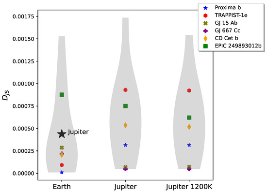 Violin plot showing the distributions comparing the simulated rocky planets to Earth (left), to Jupiter (center), and to a Jupiter clone with the temperature raised to 1200 K (right). The width of the violin plot reads like a histogram, indicating the distribution of planets clustered around the mean value. The from observed exoplanets are labeled with colored shapes; the remaining points in the distribution are from four exoplanet simulations. The physical parameters for the exoplanets are listed in Table 1. We include the comparing Jupiter and Earth in the leftmost violin plot for reference. Note that the position of Jupiter on this plot indicates that all the rocky planets but EPIC 249893012b are more Earth-like than Jupiter.