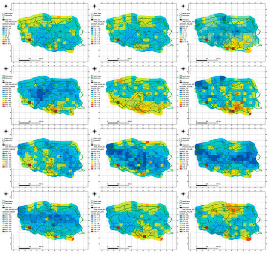 For monthly temperature data, the normal distribution proved to be the best fit, as confirmed by Anderson–Darling tests (ADT) [8,62]. In the case of monthly precipitation sums, the gamma distribution was found to be most appropriate. This probabilistic characteristic of precipitation over the Polish territory was also confirmed using the ADT. Parameters for both the normal and gamma distributions were estimated separately for each dataset using the Maximum Likelihood Estimation (MLE) method [63,64,65]. This methodology has been widely studied and is considered a “user-friendly” and robust approach in statistical analysis.