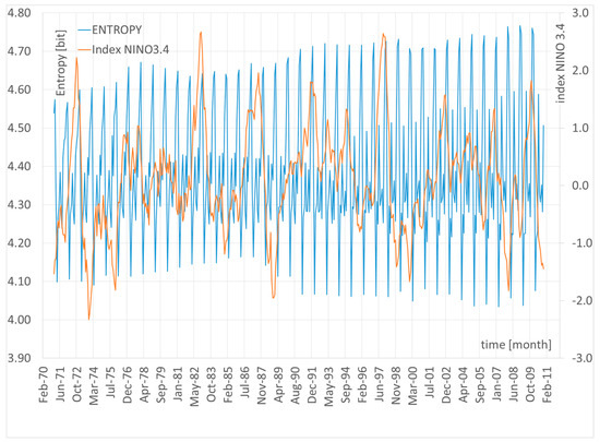 Shannon’s information entropy enables a quantitative assessment of uncertainty and randomness in climate data [6,7]. Its analysis of temperature and precipitation time series allows for the detection of changes in variability, which is particularly important in the context of forecasting extreme weather events [7]. There is a strong relationship between thermodynamic and informational entropy—an increase in thermodynamic entropy may be linked to more complex climate processes, leading to greater informational unpredictability of the data. Consequently, analyzing long-term trends in informational entropy becomes a powerful tool for identifying structural shifts in climate and assessing potential future directions of its evolution [8,9,10].