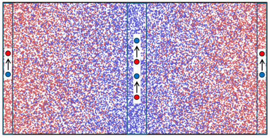 The system consisted of Lennard–Jones/spline (LJs) particles [6] in a rectangular cuboid with aspect ratio . The LJs potential is a smoothly truncated Lennard–Jones potential with cut-off distance . The MD box had periodic boundary conditions in all three directions. The box was divided into 64 layers of equal thickness in the x-direction for recording local data of temperature, density, composition, etc. The particles were of two types, 1 (“red”) and 2 (“blue”), with exactly the same mass and potential parameters [8].