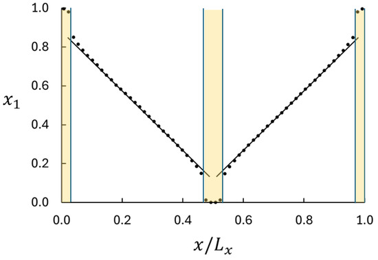 Simulation results for mole fraction profile for Case 2. The straight lines are fitted to the central part of the profiles ( and ) and used to estimate the Fick’s law diffusion coefficient from Equation (2). The positions of the swapping layers are marked yellow. The jumps in near the ends and in the center of the MD box occur between the swapping layers and the bulk. Note the slight curvatures of the profile in the bulk near the boundaries. The curvature signifies deviation from the local equilibrium and is the basis for analysis with Equation (29). The profiles for the other cases are qualitatively the same as shown here.