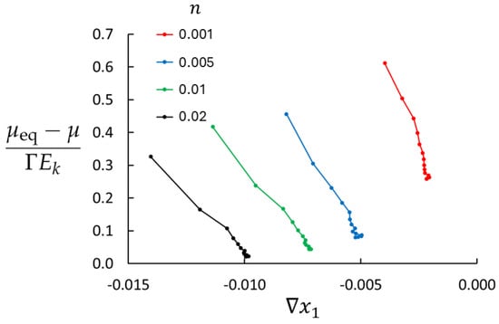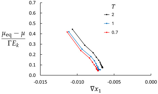 A central question in this work is to what extent LEA is valid. Equation (28) gives a direct measure of the deviation from the equilibrium chemical potential. We see that is positive. From Equation (29), we see that Fick’s law will always underestimate the value of D. The difference can be quantified with the second term in the square bracket in Equation (29). If the fraction is small compared to 1, the local equilibrium is a good approximation, reducing Equation (29) to Fick’s law. Otherwise, the approximation is poor. Exactly what we mean by an acceptable approximation is a matter of choice, but the important point is that whatever choice is made, it can be quantified and communicated. Equation (28) shows that the deviation from equilibrium depends on with the minimum value at . The minimum value of is then with .