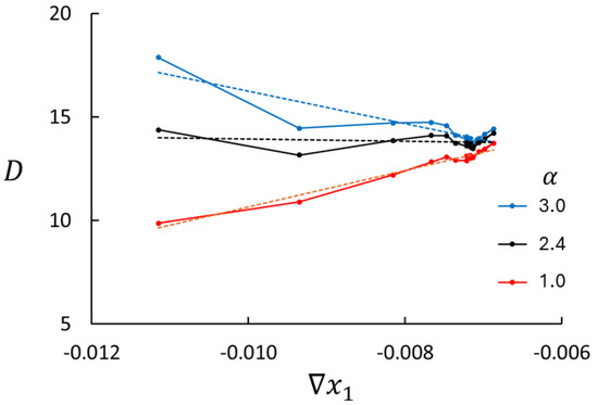 The parameter in Equation (28), which is implicit in Equation (29), was determined as follows. In principle, D may be a function of and . However, the system is an ideal mixture of particles with identical physical properties at uniform density and temperature. The diffusion coefficient in Equation (29) must therefore be independent of and . The value of was adjusted to satisfy this condition. An example of the relation between and D is shown in Figure 6. A value of that is too large (small) gives too much (little) emphasis on the curvature in , especially near the ends of the mole fraction range (cf. Figure 2). By fitting a linear function to D vs. , was determined as the value giving zero slope (=2.4 for Case 4 shown in Figure 6). We note that the value of D for the largest values of , where the -profile is linear, is not very sensitive to the value of . This procedure gave almost the same value for for the six cases studied here (Table 2).