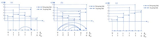 Considering the predefined time arrow, as suggested in previous works [], the directionality can be explicitly introduced through the use of directed networks or digraphs. This leads to the definition of the DHVG, a directed variant of the HVG. In this directed graph, the degree of node t is split into an ingoing degree, , and an outgoing degree, , such that: