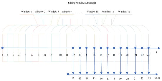 In this study, the KLD is calculated within the framework of the sliding window technique to detect abnormal events in the time series. The sliding window method, also referred to as the rolling window approach, is a prevalent technique in time-series analysis. It involves partitioning the entire time-series data into smaller, overlapping segments or “windows” to analyze specific characteristics or patterns within each window (depicted in Figure 2).