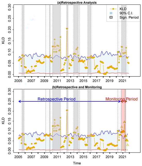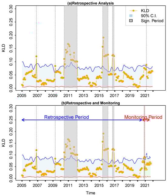 Firstly, the financial time series from the Spanish markets is selected to illustrate the application of the proposed KLD method for retrospective analysis and real-time monitoring. The whole return rate time series from 2005 to 2022 will be analyzed using the proposed method, so that idiosyncratic incidents can be identified in the retrospective analysis (Figure 5a). In Spain, notable events included the economic boom in 2006, driven by the construction and real estate sectors, which was subsequently followed by the impact of the global financial crisis in 2009. This led to a severe economic downturn characterized by high unemployment rates and banking sector difficulties. During the years 2011–2012, Spain struggled with the sovereign debt crisis in the Eurozone, resulting in austerity measures and further economic contraction. In subsequent years, the economy gradually recovered with structural reforms and external support, leading to improved economic growth in 2014. However, the COVID-19 pandemic in 2021–2022 posed new challenges, particularly impacting sectors like tourism and services, thereby affecting overall economic stability. The time series of return rates is subsequently partitioned into two segments, 2004–2020 and 2021–2022, designated as the retrospective period and the monitoring period, respectively. During the retrospective period, the KLD method was implemented directly. In contrast, during the monitoring period the sliding window advances by one step upon the arrival of each new real-time data point. Figure 5b displays a comparison between the retrospective analysis and real-time monitoring, revealing a satisfactory level of consistency, with a Kappa coefficient of 0.65.