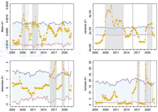 Retrospective analysis for identifying abnormal events from financial time series in Spain: (top left) first-order moment, mean; (top right) second-order moment, variance; (bottom left) third-order moment, skewness; (bottom right) fourth-order moment, kurtosis. The symbols have the same meaning as those in Figure 5.