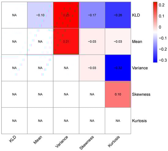 Secondly, the performance of the proposed KLD method will be compared with that of moment-based metrics: mean, variance, skewness, and kurtosis. The sliding window technique is also applied, and the 90% confidence intervals are constructed accordingly. Figure 6 presents the retrospective analysis results based on the moments. For the first, second, and fourth moments, data points located below the lower bound of the 90% confidence intervals are not considered as abnormal data points. For the first moment (mean), fewer abnormal data points have been detected, especially the idiosyncratic incidents in 2009 and 2020, which have been missed. The widths of the significance periods are also smaller. For the second moment (variance), although more data points have been identified as abnormal, these points are aggregated and considered as single events. For the third moment (skewness), many abnormal data points before 2016 have been missed. For the fourth moment (kurtosis), the identified abnormal data points are almost identical to those identified by the third moment. The consistency between the KLD metrics and the four moment metrics is summarized using the Kappa coefficient, as presented in Figure 7. It can be found that fair agreements exist only between variance and KLD or between variance and mean. The advantage of applying the KLD metric for detecting anomalies can be intuitively illustrated in Figure 1. The three segments of the time series comprise identical data points but vary in their temporal sequences. Consequently, the estimated moment values remain the same, whereas the degree distributions differ. Hence, the KLD metric is capable of detecting the abrupt change in this segment.