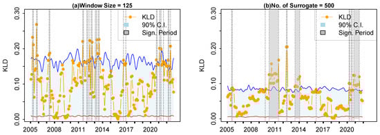 Thirdly, the results of retrospective analysis based on the KLD metric with different sliding window sizes or numbers of surrogate time series are presented in Figure 8. In Figure 8a, the sliding window size is 125 (approximately half a year). It can be found that when the sliding window size becomes smaller, more isolated abnormal data points are identified. Thus, single idiosyncratic incidents can be identified as separate incidents. Conversely, independent and consecutive idiosyncratic incidents might be identified as a single event when the sliding window size become too large (not illustrated as figures here). In Figure 8b, the number of surrogate time series is 500. When compared to Figure 5a, the upper boundary of the 90% confidence intervals becomes flatter, but the results of the retrospective analysis do not qualitatively change. We notice that a higher number of surrogate time series is encouraged, although the number 100 is large enough to generate a reliable confidence interval.