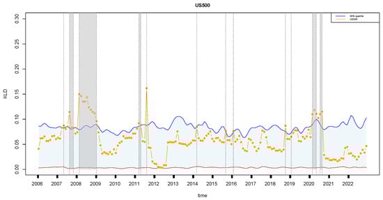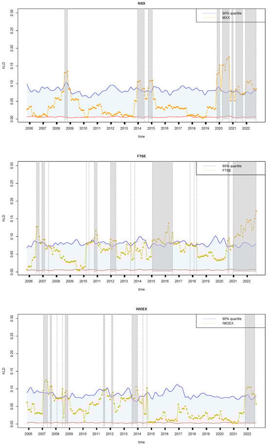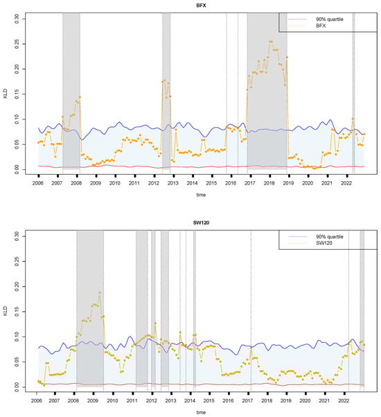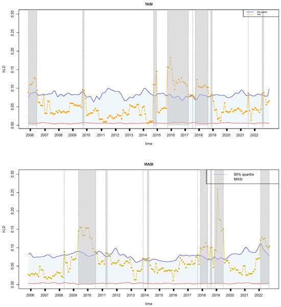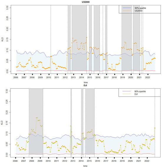 (4) Compare the KLD value of the original time series with the confidence interval. Idiosyncratic events are identified if the actual KLD values exceed the confidence interval. If the actual KLD value from the original time series exceeds the established confidence interval, it signals an anomalous event that is statistically significant and deviates from the expected behavior. These outliers may correspond to significant financial market changes, economic shocks, or other critical events.